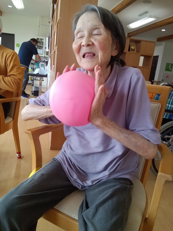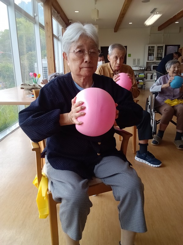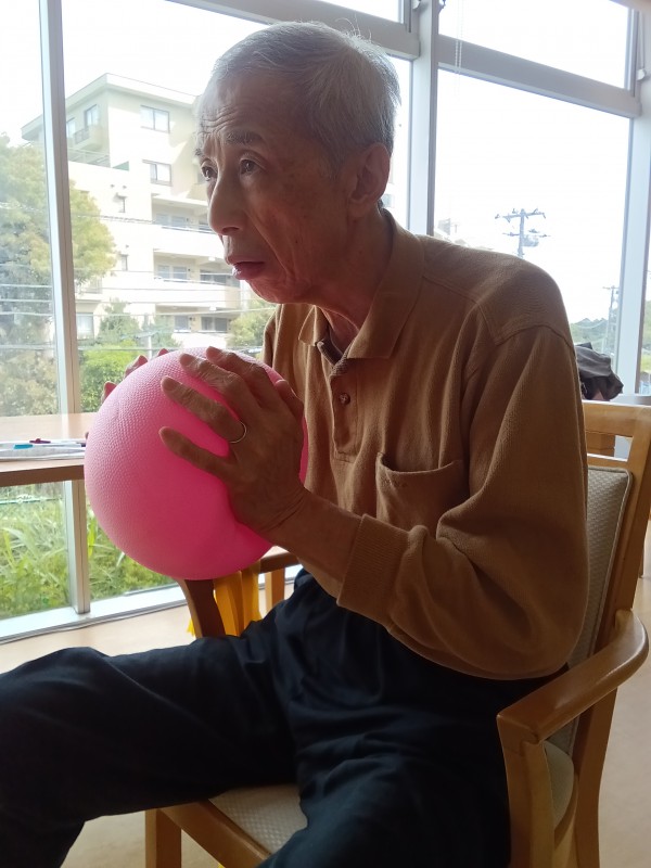 ボールを両手で挟んで腕や胸の筋肉を鍛えます!声も出します!!