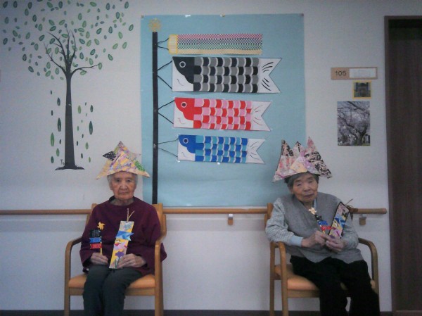今日は5/5こどもの日レク・小さい鯉のぼりを作り大きい????貼り絵の前で写真を撮りました。そのご様子をお知らせいたします!