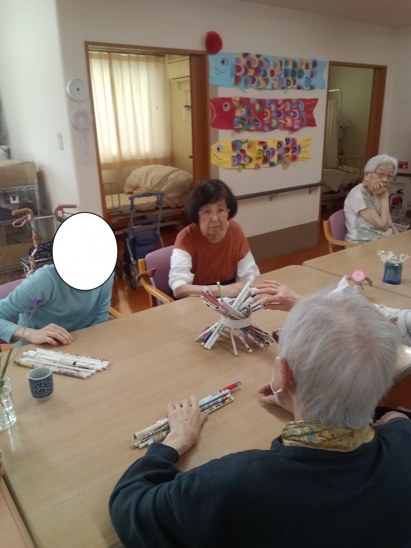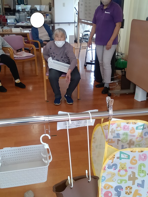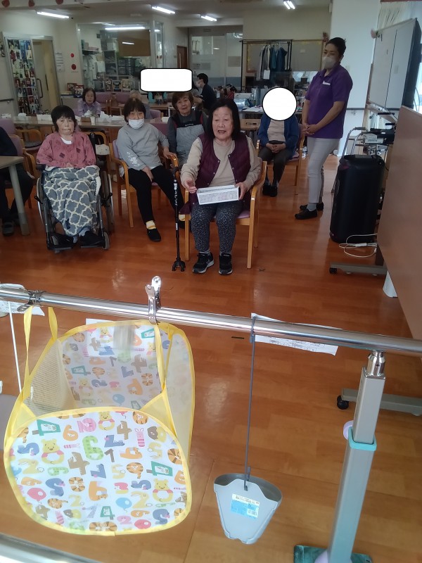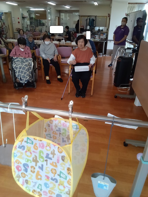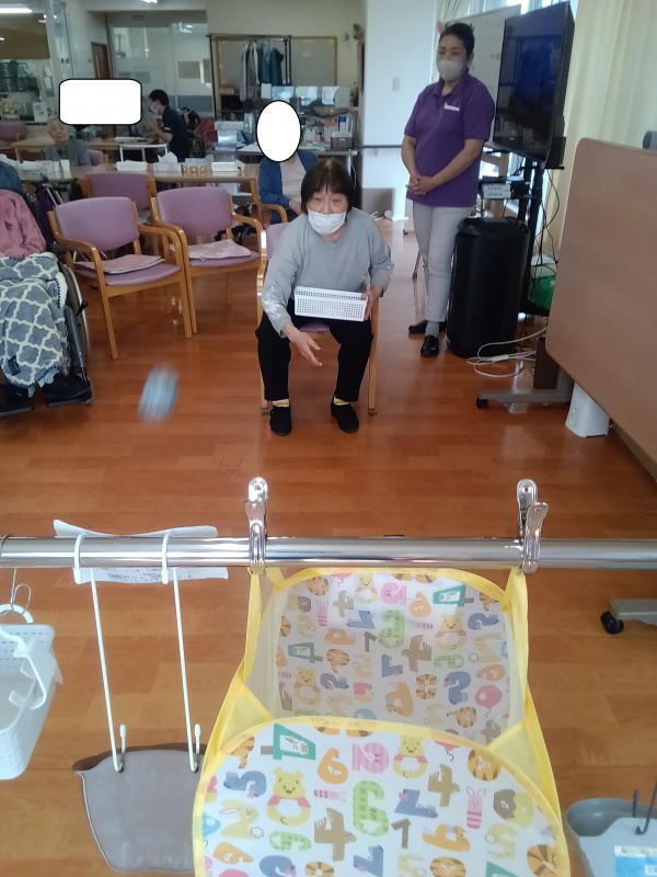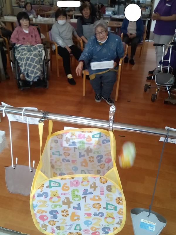 平行棒に色々入れ物をぶらさげて、そこにお手玉を投げ入れていきます。