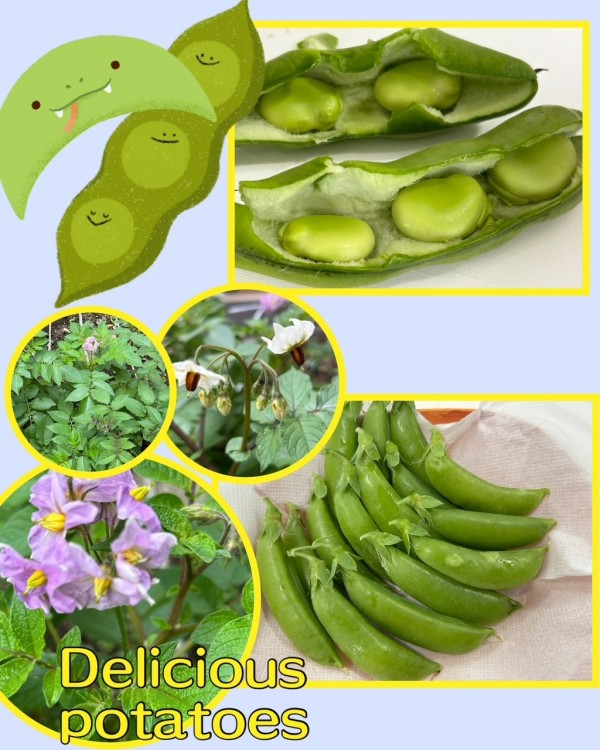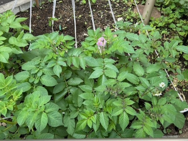 ジャガイモは、春から初夏にかけて花を咲かせ、葉の下の地中にイモが育っています。