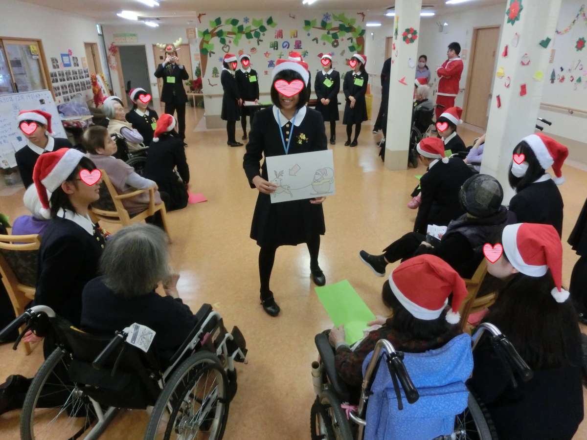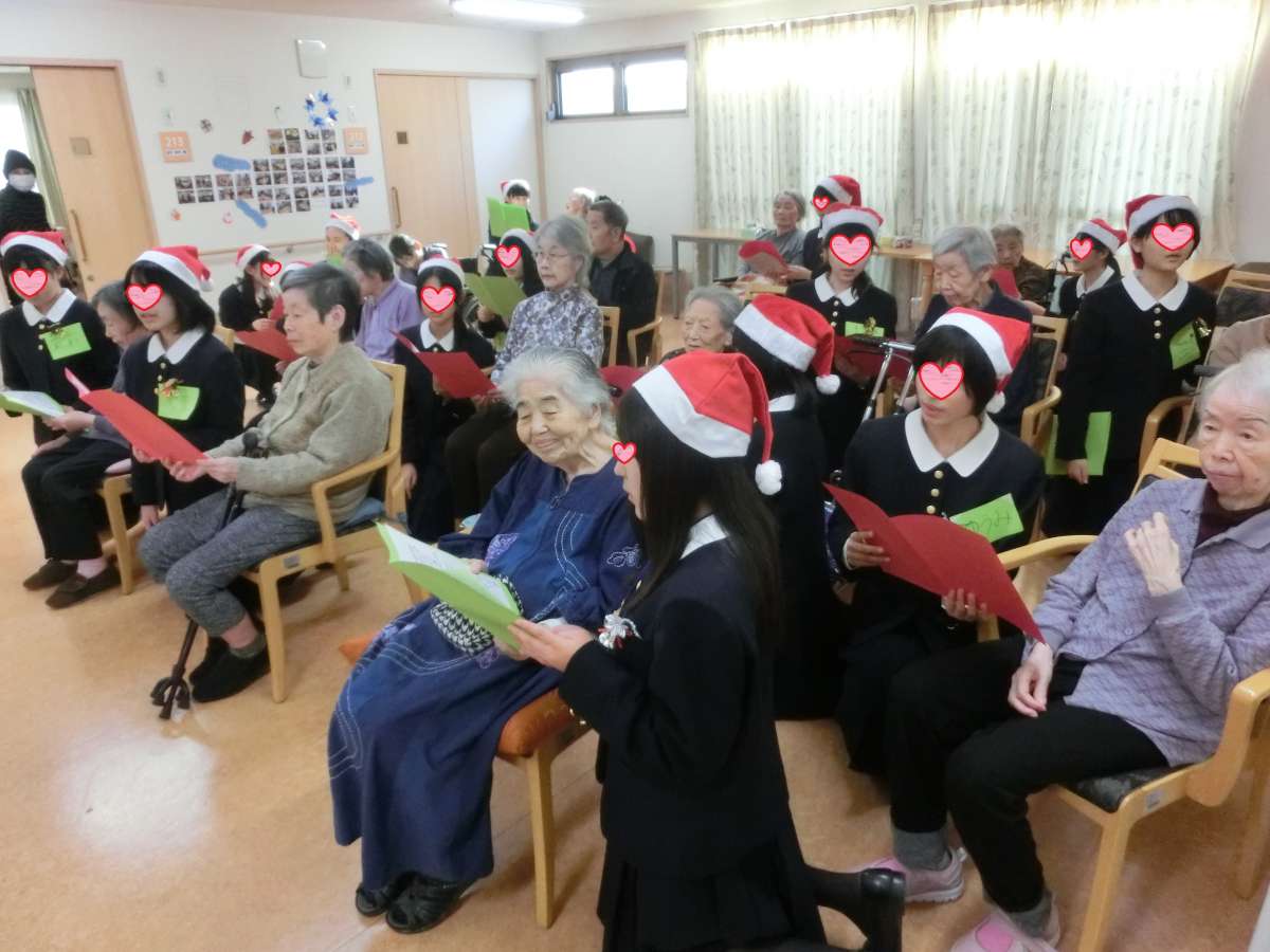 挨拶を終え、生徒方々と入居者様交えて『あわてんぼうのサンタクロース』『ジングルベル』2曲を合唱、併せて『クイズ大会』も開催!!