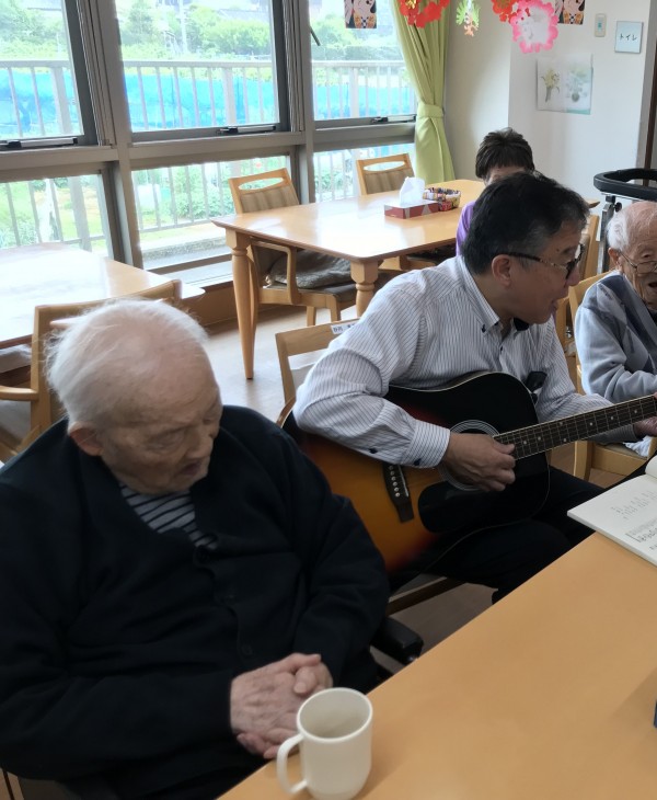 2階の食堂にいたご入居者様と童謡や小学校唱歌を楽しんで頂きました。