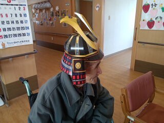 ホーム長手作りの兜をつけた