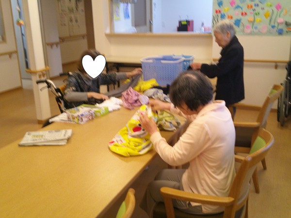 1階入居者様方に洗濯物たたみのお手伝いを協力してもらいました
