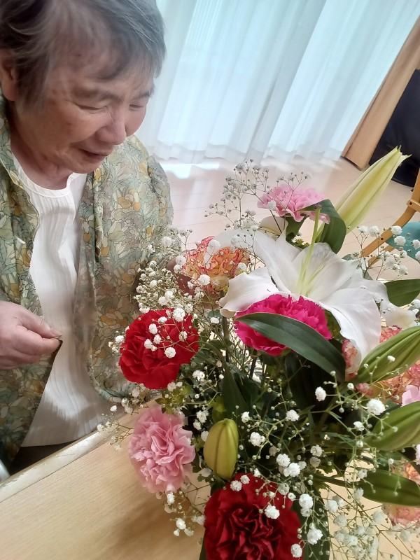 幸せそうに微笑まれるお母様(n*´ω`*n)カーネーションをご覧になられお母様もご家族様を思い出されていたと思います(#^.^#)