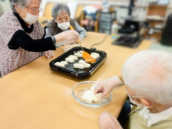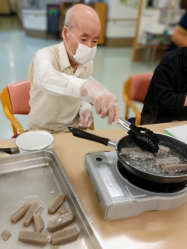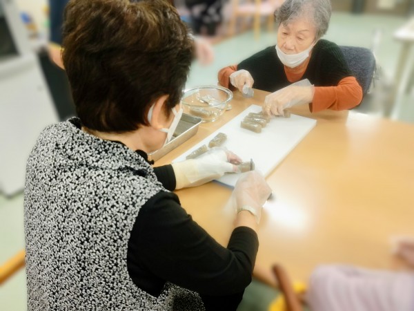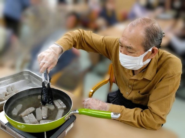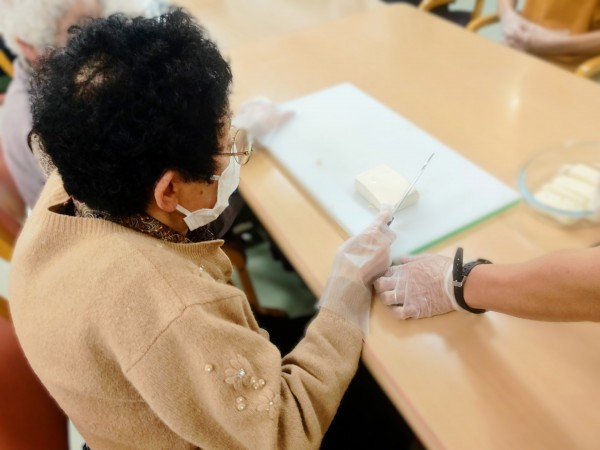 事前に職員が水抜きをした木綿豆腐とこんにゃくを1.5㎝位の幅で切って頂き