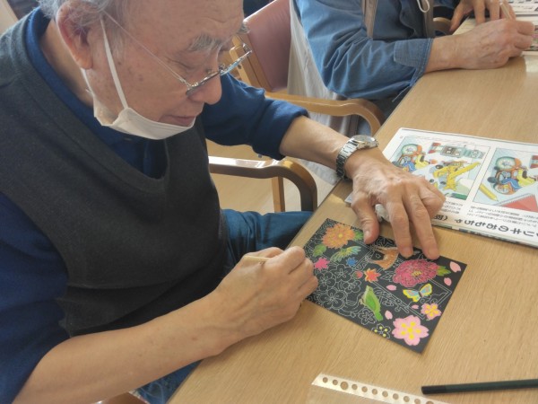 黒い紙を竹串で削っていくと色が出て、絵が出来上がります!