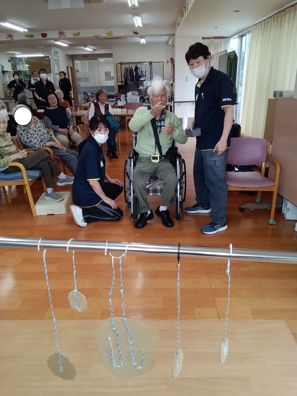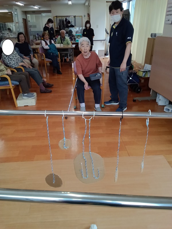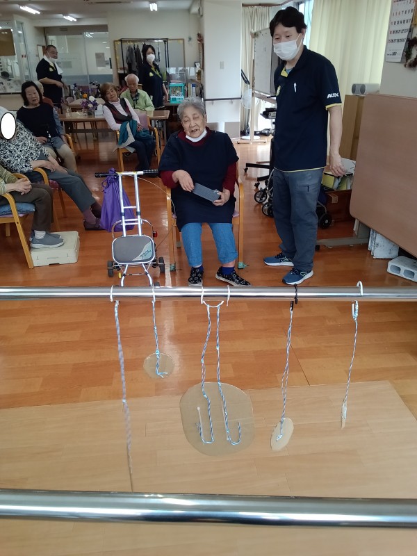 平行棒にぶら下がっている的に、お手玉を投げて当てます。