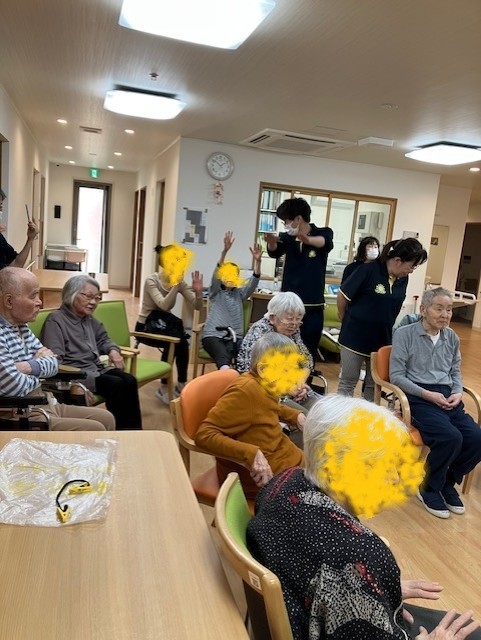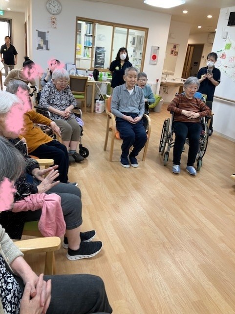 フラダンスの衣装を着た先生と生徒さんに、利用者様も何々、何事! ビックリされてました。