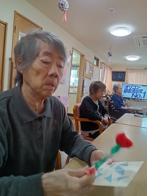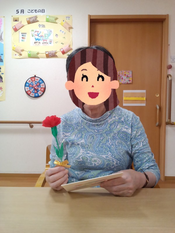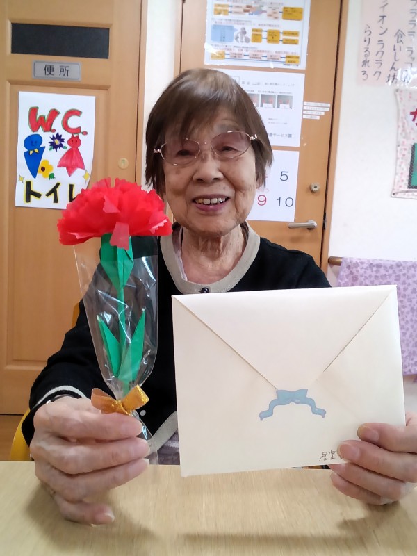 皆様が集まったおやつの時間に、手作りカーネーションと手紙をプレゼントさせて頂きました。