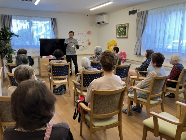 ホーム内で涼んで頂きながら訪問運動教室の岡田先生の登場です♪