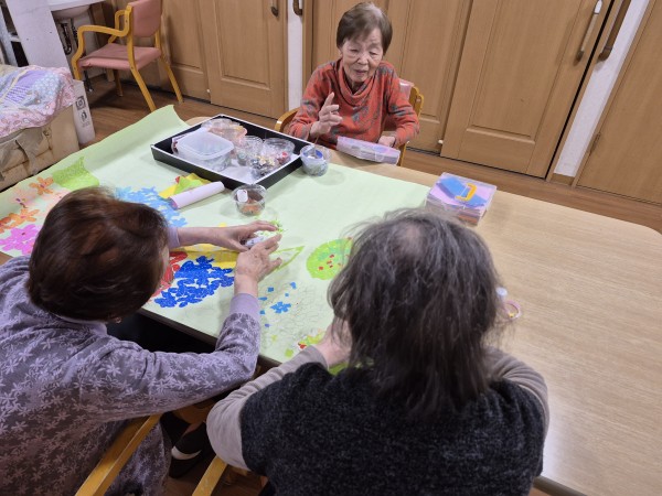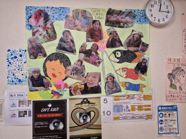 このように、下のちぎり絵は利用者様制作、上の写真は5月の様子がふりかえられるように、掲示されていました。(*^▽^*)