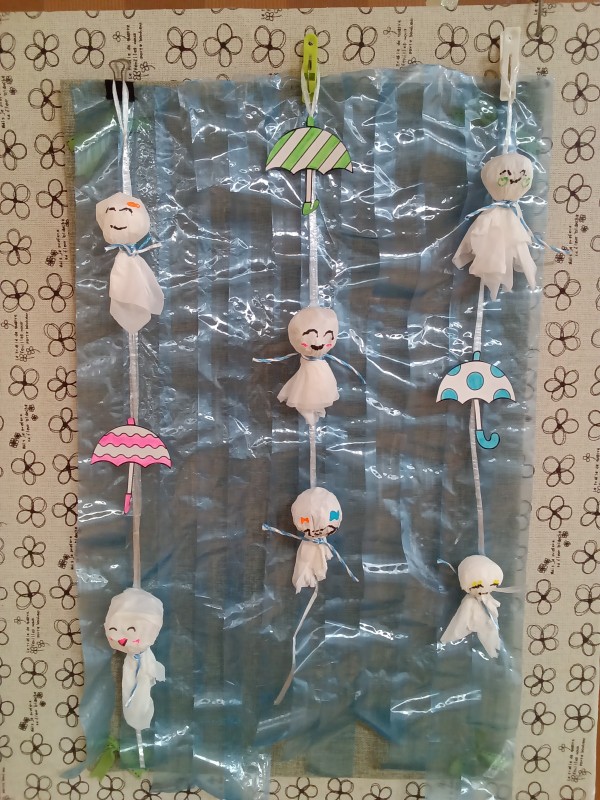 すずらんテープで雨を表現して飾り付けました。とってもかわいいてるてる坊主がたくさんできました(*^^*)