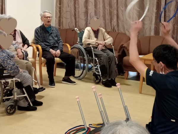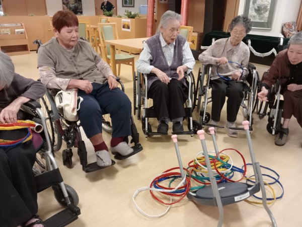 準備体操の後は 椅子の的に向かって輪を投げますよー!