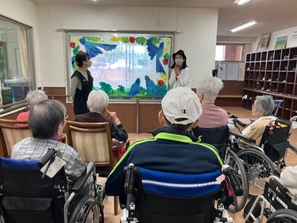 私の祖母も施設にいました。手前に描いた2羽の鳥のように寄り添って介護してくれる施設の皆様にも絵から何かしらの前向きな