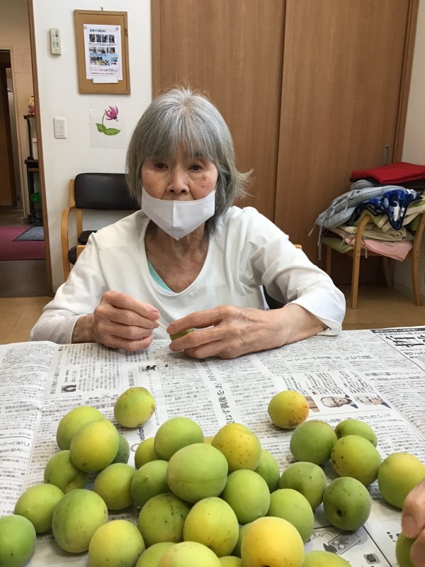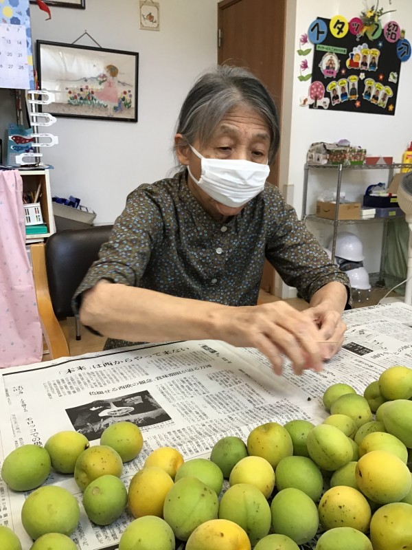 梅ジュースにするにはまだ青い梅がいいようで、いただいてから数日経ったら甘い香りがしてきたので、ご利用者様に急いで漬けていただきました!