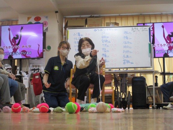 床に並べられたボールやお手玉をお宝に見立て、紐の先に輪の付いた道具を投げ、どれだけとれるかを競います。まるで西部のカウボーイになった気分で、皆様チャレンジせれていました。