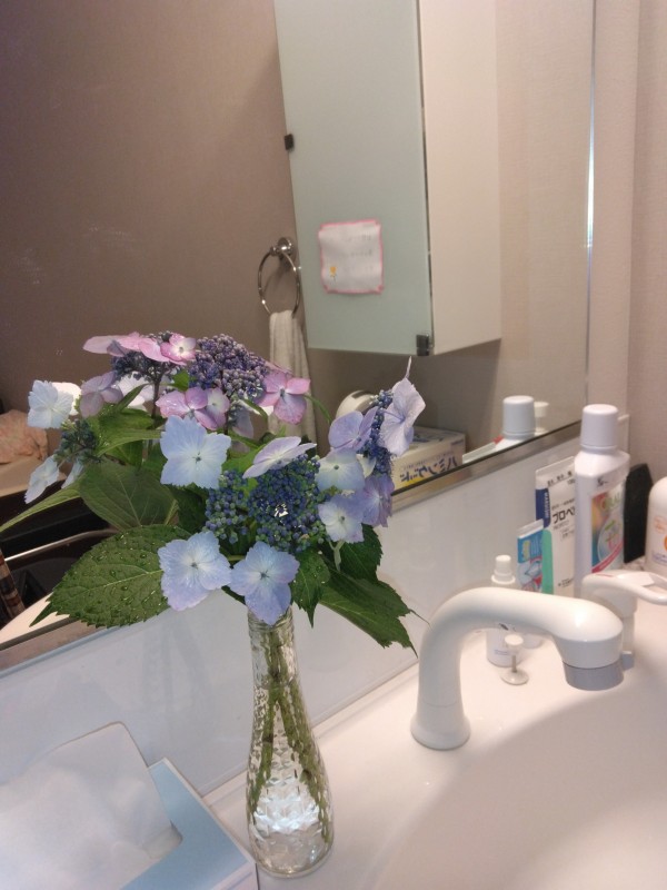 そんな中、施設の敷地内にアジサイがきれいに咲いているのを見つけたので少し拝借し施設内で飾らせてもらいました(#^.^#)