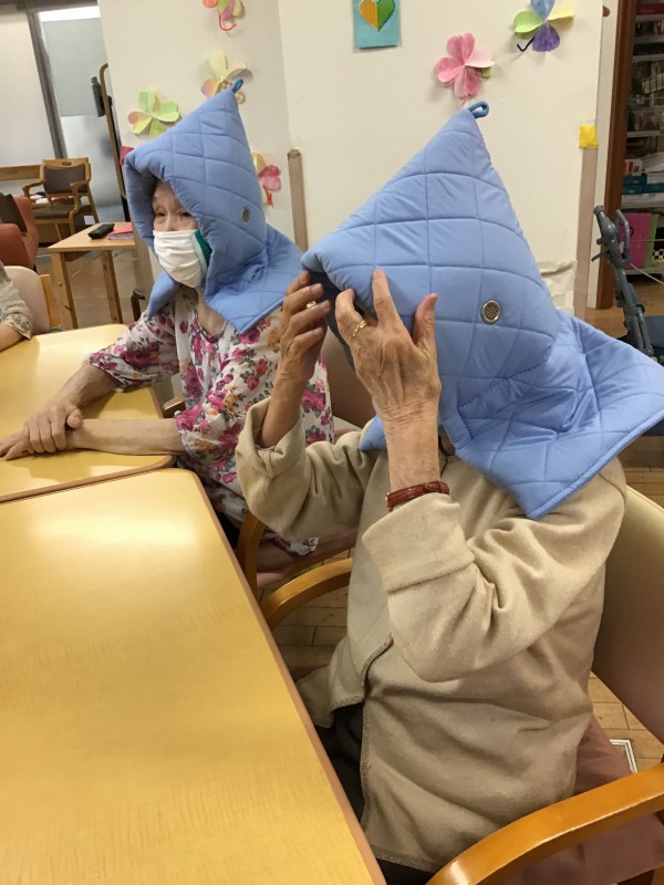 まずはきっちりと防災頭巾を被る練習です(#^^#)