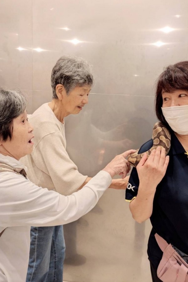 そんな癒しのひとときのなか、ひときわ盛り上がったのがヘビとのふれあい。