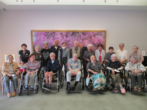 館内には、現代リアリズムの巨匠・三栖右嗣氏の迫力ある絵画が数多く展示されており、その写実的で力強い作品に、皆様じっくりと見入っておられました。「この果物の絵、写真みたい!」「花の絵がとても印象的だった」と感性豊かな感想が飛び交い、会話も弾みました。そして何よりも印象的だったのは、作品を眺めながらカフェで頂くおはぎと飲み物!アートと甘味の贅沢な組み合わせに、「絵を見ながら食べるおはぎなんて初めて」「これは最高ね」と皆様大満足のご様子でした。記念撮影ではお気に入りの作品を背景にパシャリ!帰りの車内でも、「また行きたいね」と嬉しい声が聞かれました。