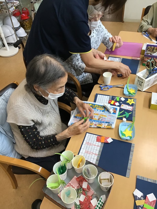 折り紙で織姫、彦星を作っていただき、周りを飾り付けしていただきます。