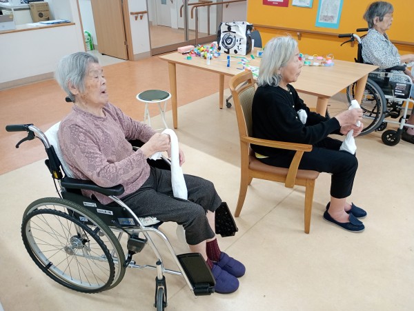 この日は、タオルを利用した軽い筋トレ「タオル体操」をおやつの時間前に行いました。