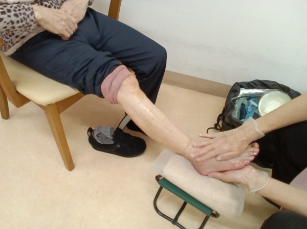 この日も、2名のご利用者様の様子を見させていただきましたが、居室で受けられた方は、終始笑顔で会話されながら施術を楽しまれていました。