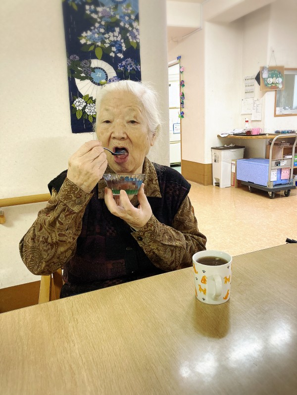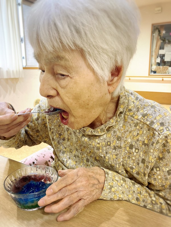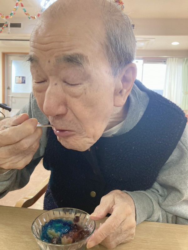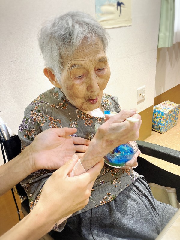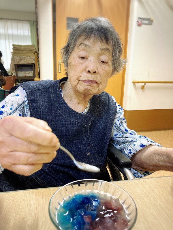 母の日おやつレクに引き続き父の日おやつレクホーム長お手製のアジサイゼリーをいただきました(⌒∇⌒)