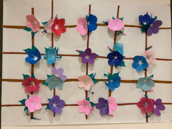 昔ながらの垣根に咲く朝顔をテーマに、みなさま思い思いの色を選んで制作していただきました。