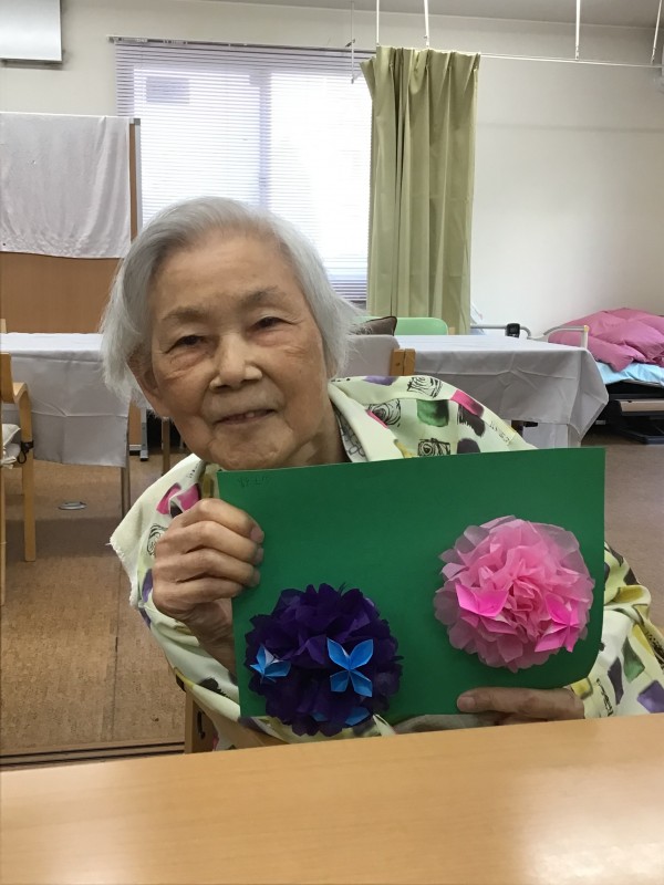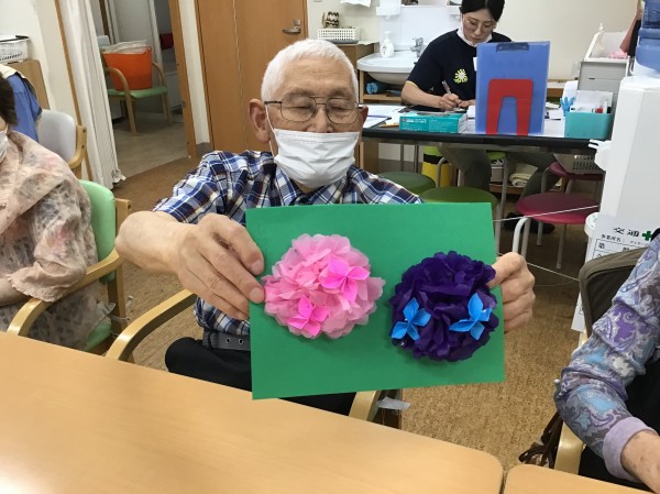 お花紙で作った紫陽花と、折り紙で作った紫陽花を合わせて貼って出来上がり!!