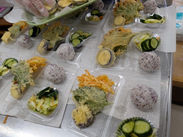 そうめんのお供は、ゆかりおにぎりに、天ぷら3種(かき揚げ、大葉、なす)にお新香☆