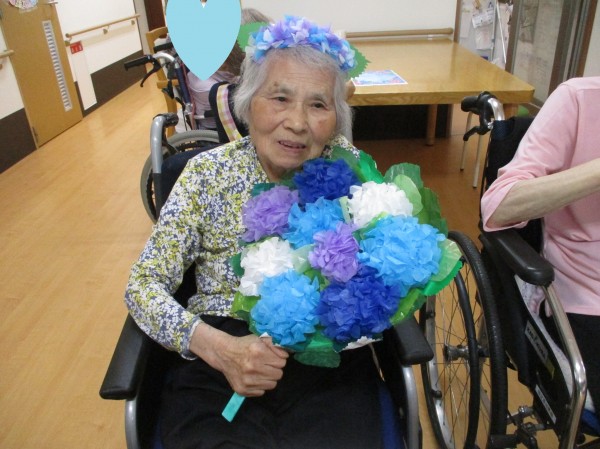 1階の皆様が5月の終わりに作っていたお花紙のアジサイをうちわに貼って、職員手作りのカチューシャもつけて記念写真をとりました♪
