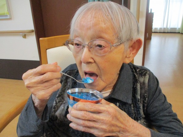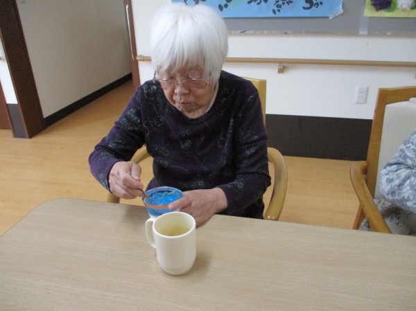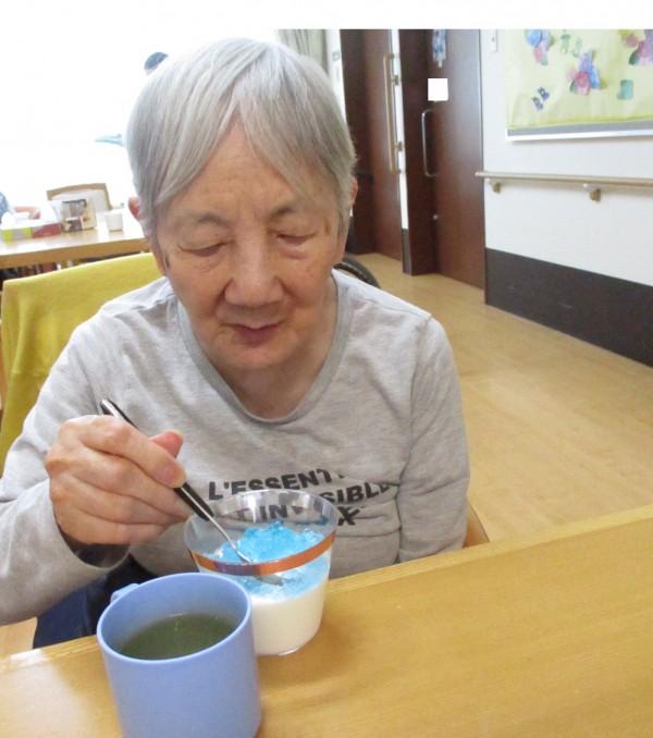 こちらがおやつの写真なのですが、下の層はミルクプリン、その上に水色・青色・紫色のゼリーをクラッシュし、アジサイの様な見た目の、職員の愛情たっぷりプリン&ゼリーです( *´艸`)
