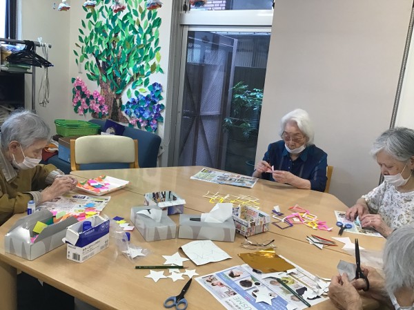半分に折った紙をすだれ状に切ったりと細かい作業が多いご様子でしたが「難しいわね…」と仰りながらも集中して取り組まれていました。