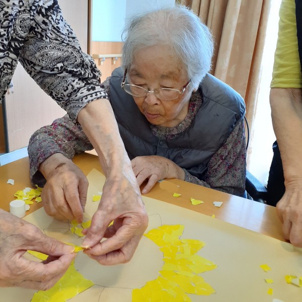 折り紙をちぎり、のり付けをして
