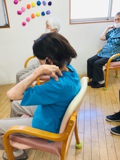 肩をほぐしたり、肘をくっつけて、肩甲骨を動かします。