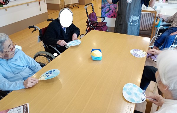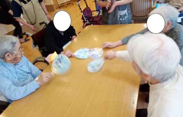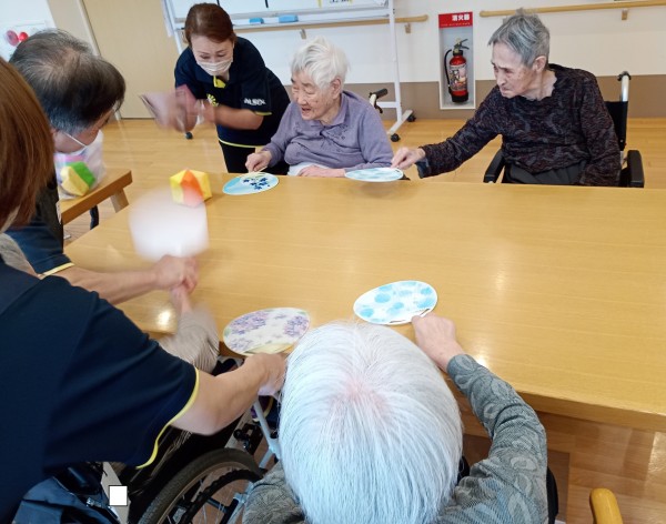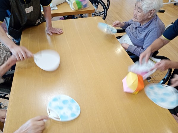 本日、7月7日に紙風船をうちわであおいで相手側に落とすレクリエーションを二人一組で行いました。