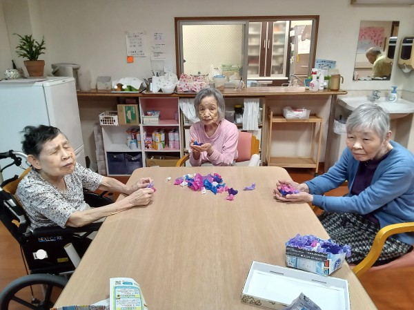 虹を作成の為、折り紙でちぎり絵です。細かい作業でしたが、少しずつ時間をかけて皆さんに貼っていただきました。