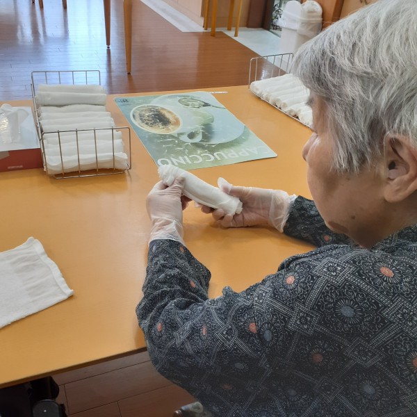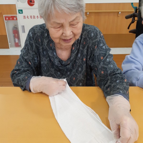 “おしぼり作り”を 利用者様に手伝って
