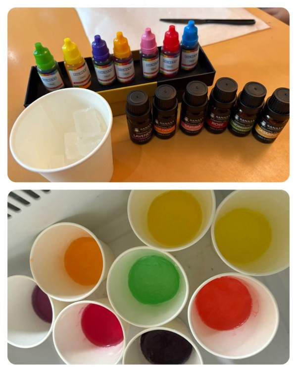 細かく刻み、好みの色を紙コップに入れ、透明のグリセリンソープを流し入れます。