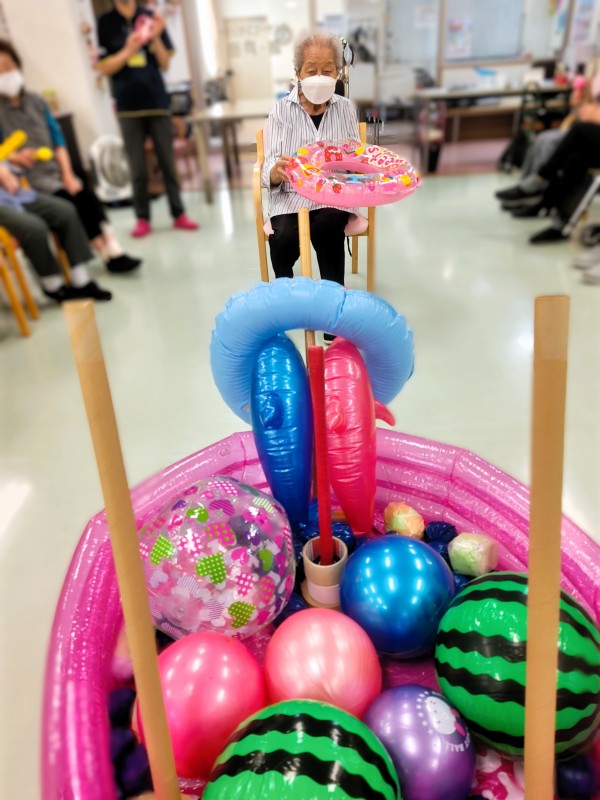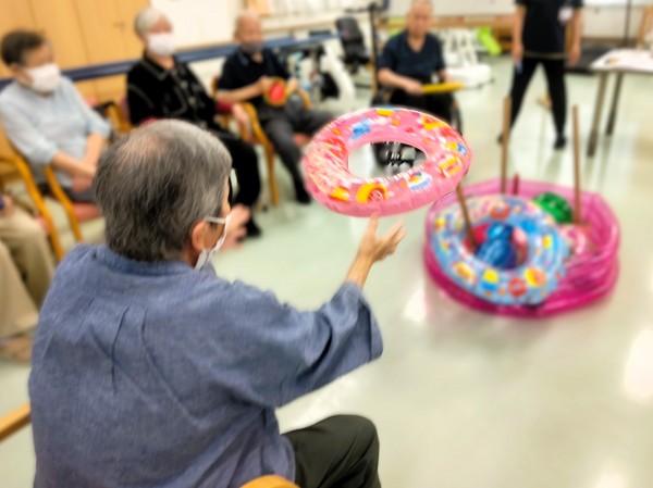 輪投げの要領で、できるだけ高得点を狙って浮き輪を投げていただきました!