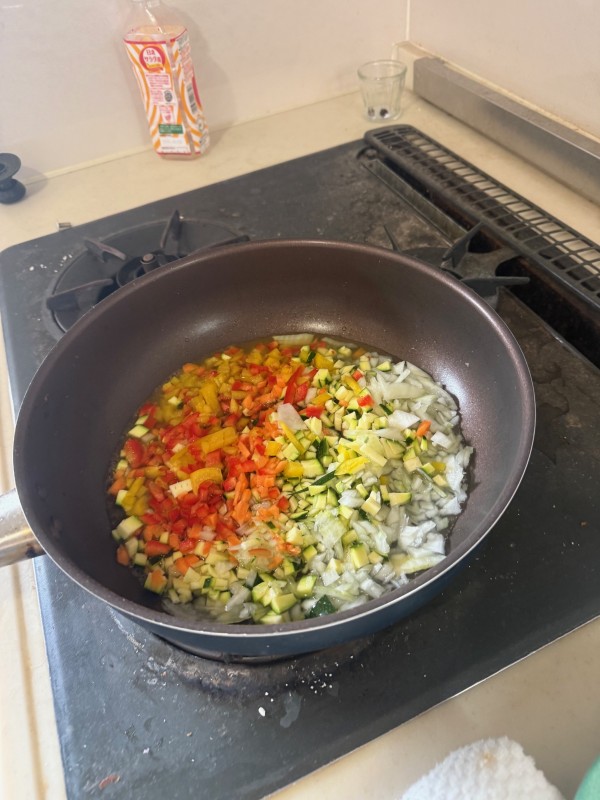 夏野菜のパプリカ、ズッキーニと人参、玉ねぎ、ツナに卵!