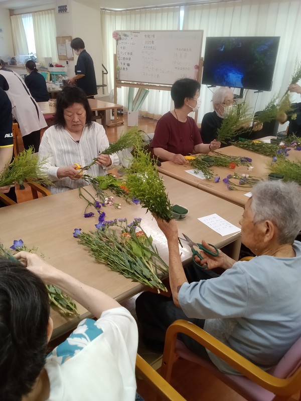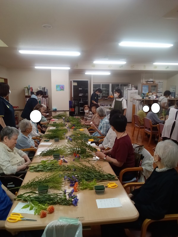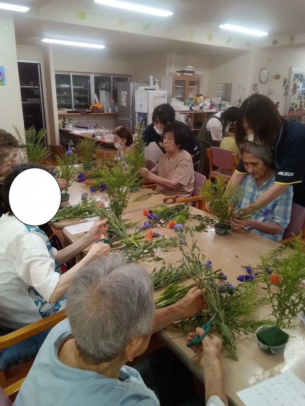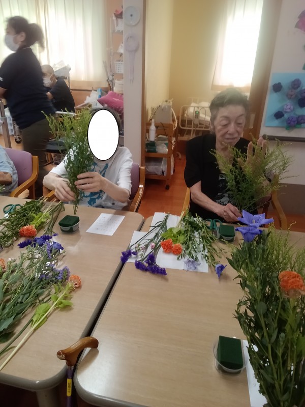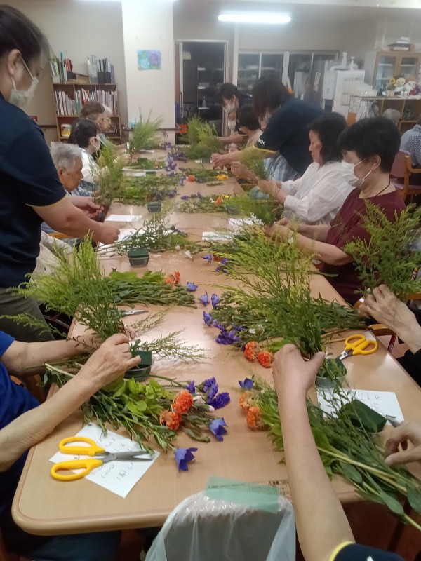 説明が終わったらお花を順番にオアシスに挿していきます。