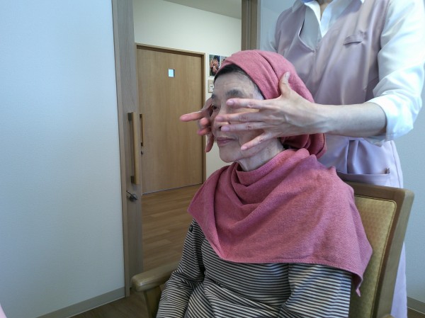 その後、いい香りの化粧水を塗布し、お顔のマッサージを行います。