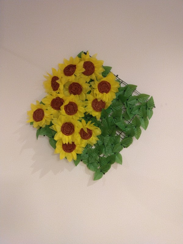 先日皆さんに作って頂いたヒマワリは現在廊下の壁に飾ってあります。2階のヒマワリと3階のヒマワリ、少し違いがあります。お時間ありましたら見て下さい。食堂近くの壁に貼ってあります。