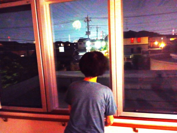 大きな花火の音に反応して、窓から外をのぞく