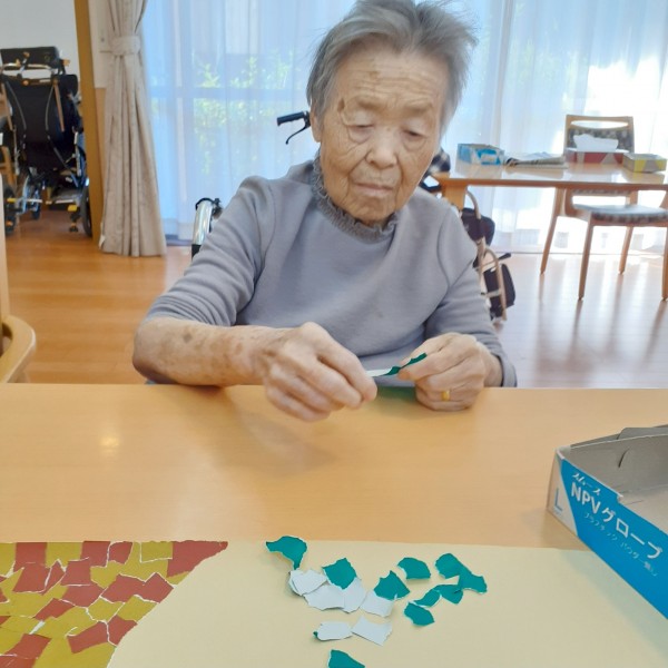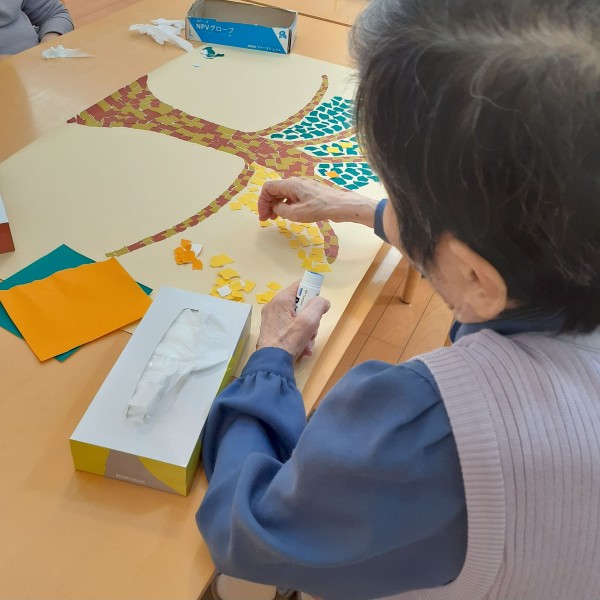 折り紙をちぎり、のり付けをして