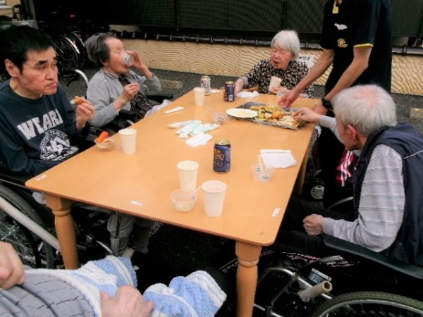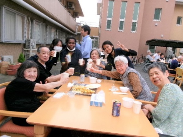 施設の前に集まり、外気浴をしながら、