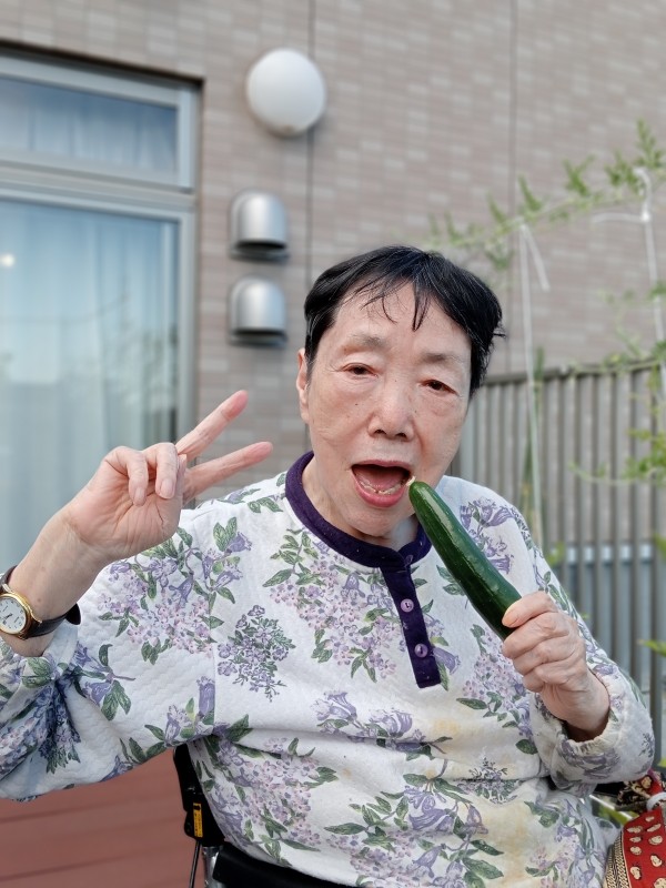 夏の太陽の光をたくさん浴びてよく実ったキュウリです。施設の皆様の水やりのおかげです。いつもありがとうございます。